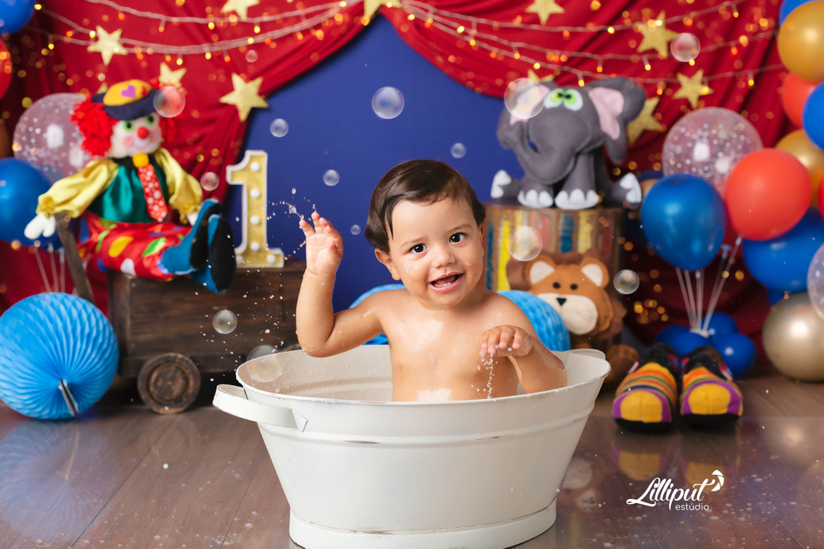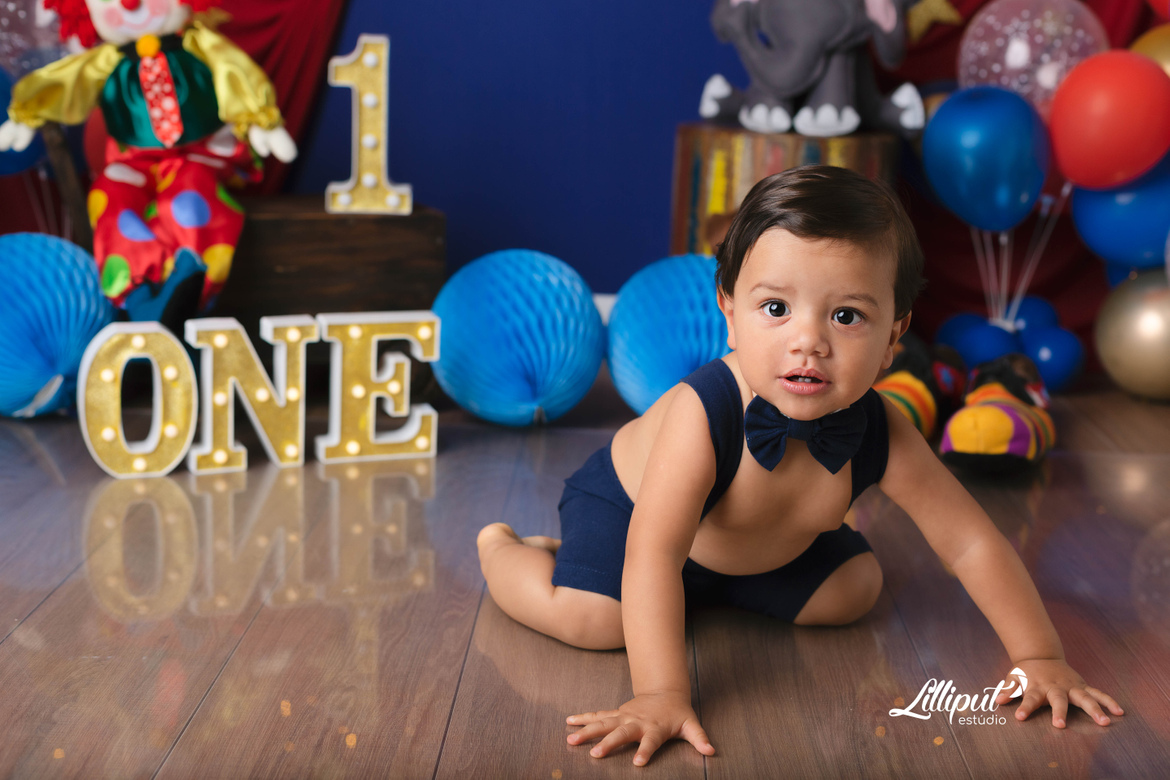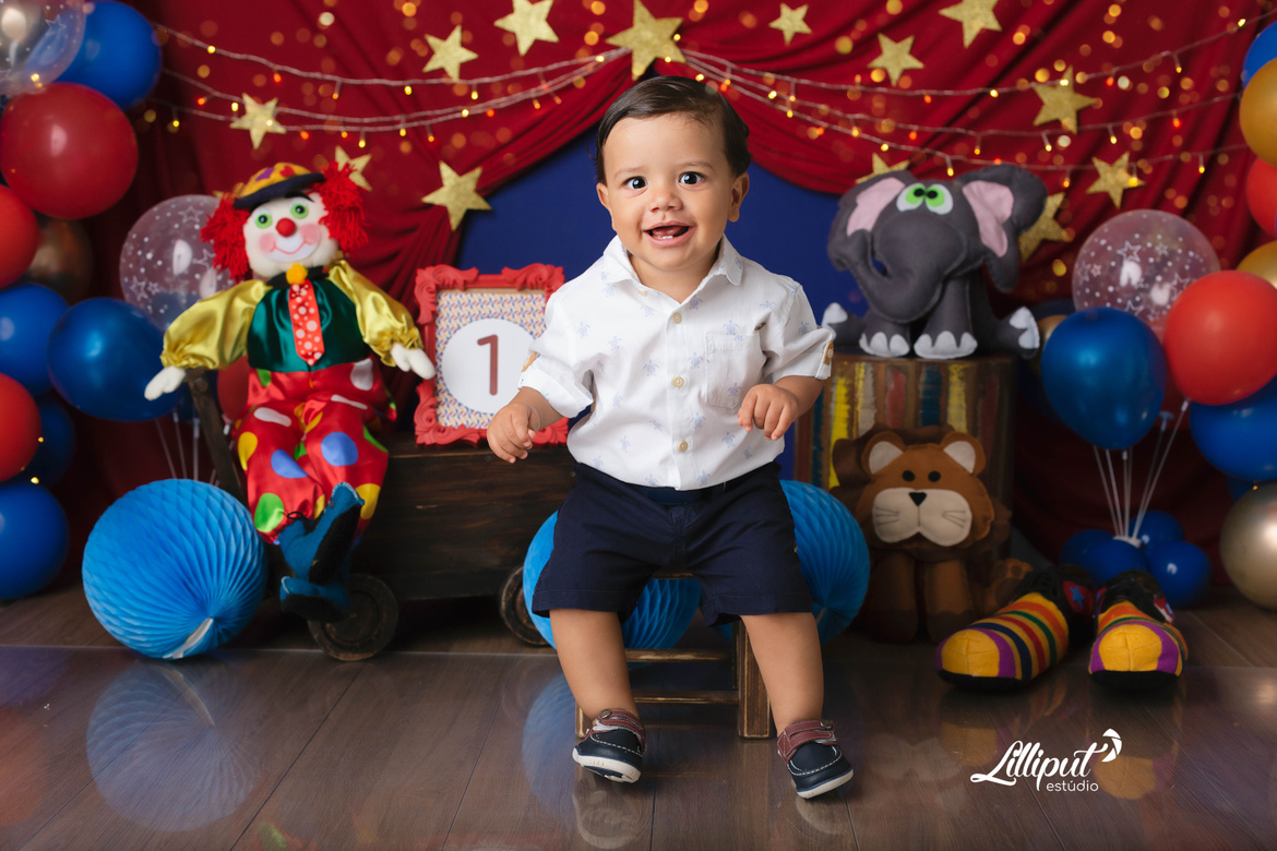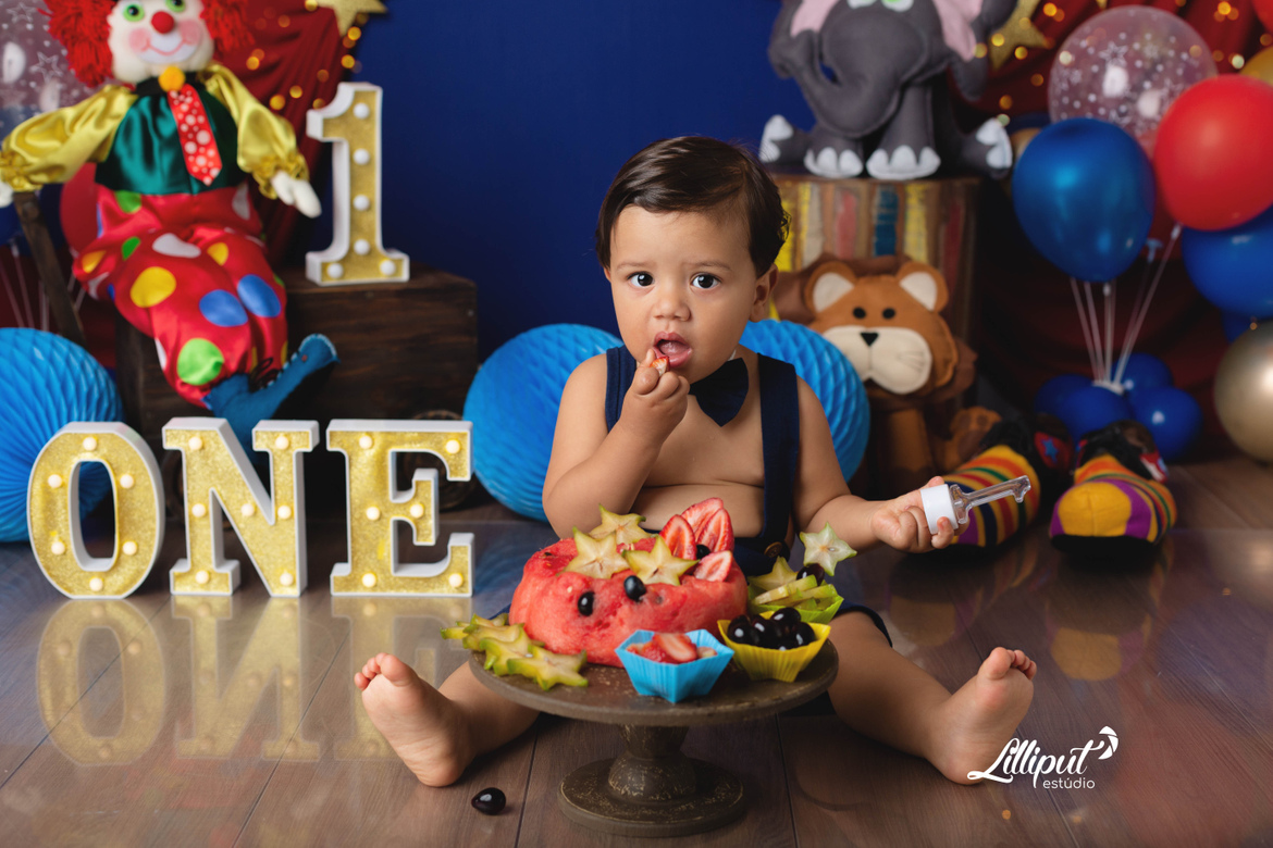 Circo, criança e festa tem tudo a ver. Esse é um dos temas preferidos das mamães que querem celebrar o primeiro aninho de seus bebês no ensaio cake smash. O Vitor, na verdade, se deliciou com um “bolo“ de frutas preparado especialmente pela vovó.